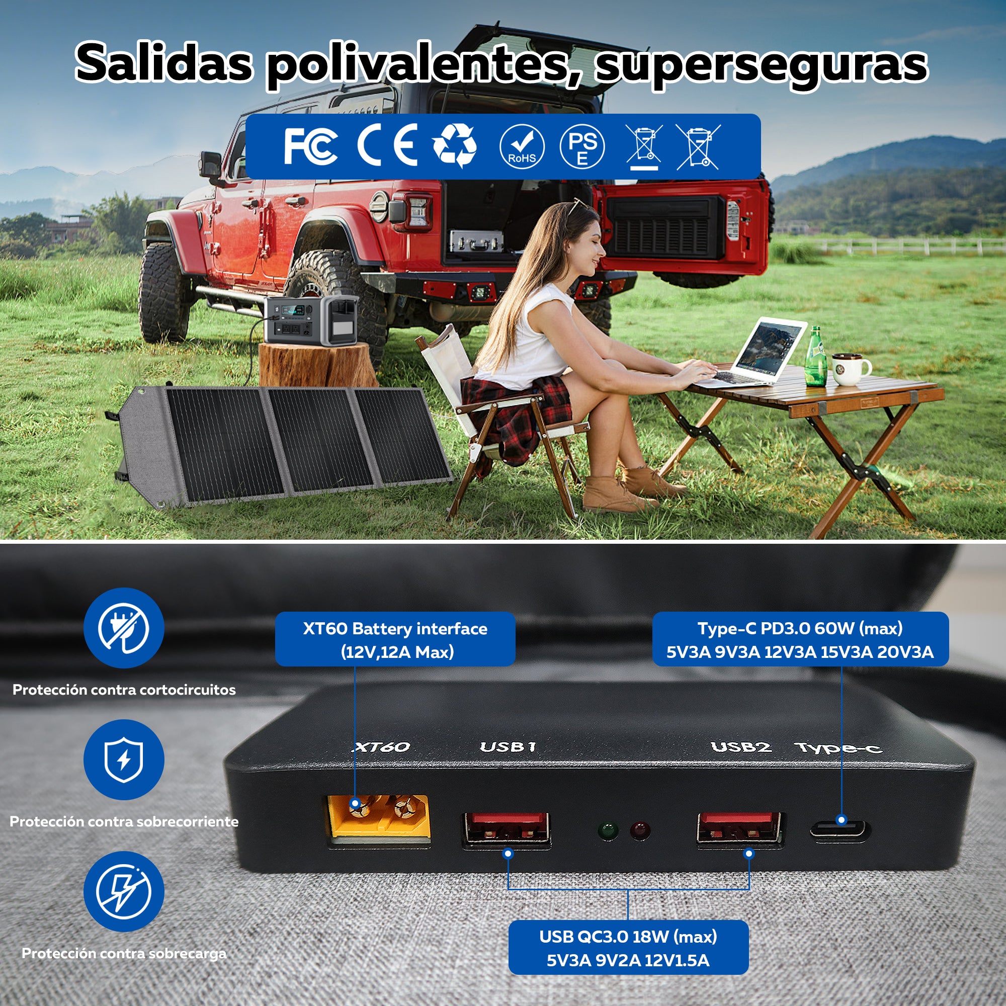 Panel solar universal con Type-C 60W, USB 18W, XT60 y múltiples puertos DC—compatible con el 90% de las estaciones de energía, baterías LiFePO4 y dispositivos USB como teléfonos, laptops y relojes inteligentes.