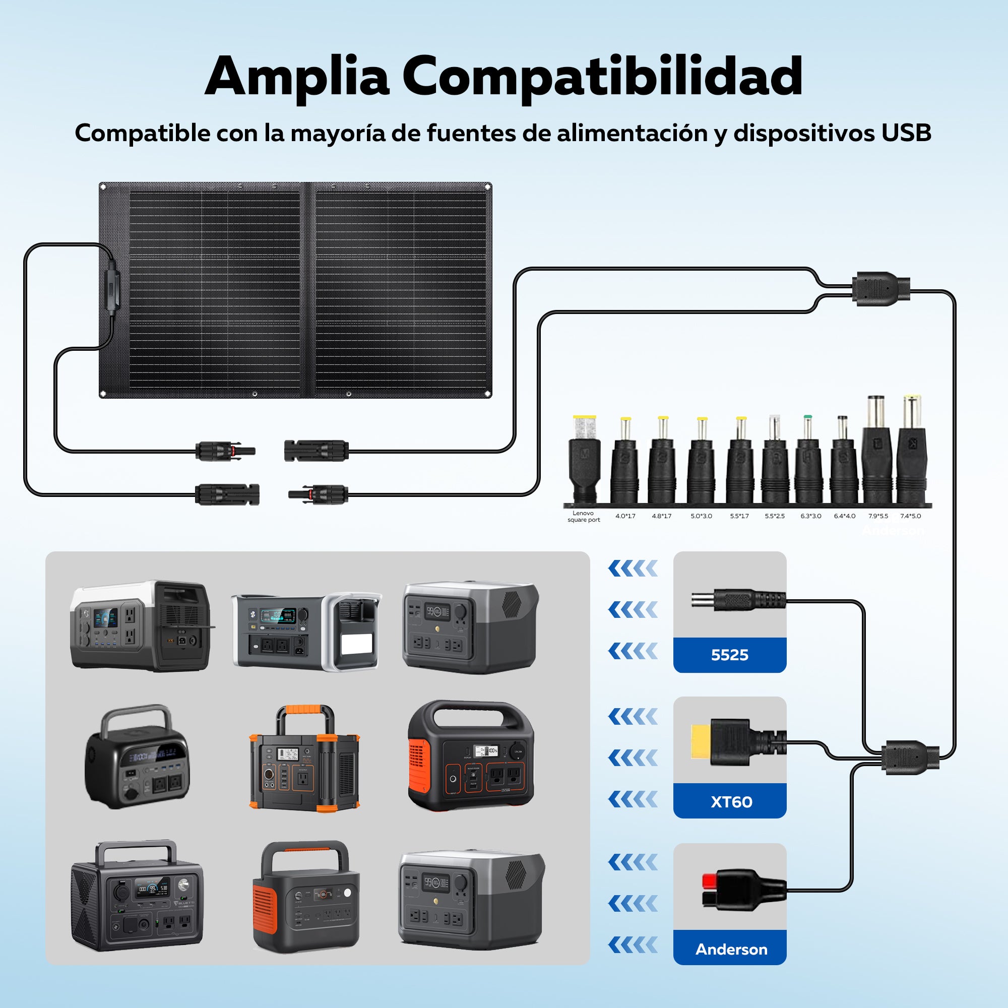 Los paneles solares CTOLITY admiten puertos de salida XT60, Anderson y 5525, lo que los hace compatibles con el 90 % de las centrales eléctricas portátiles del mercado. Los conectores MC4 garantizan un suministro de energía estable a una amplia gama de dispositivos fuera de la red eléctrica, ideales para camping, autocaravanas, emergencias y estaciones de trabajo móviles.